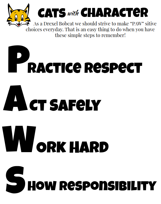 We will also be focusing on four basic expectations that will help our students be successful in all settings. These expectations will be known as our PAWS. As a Drexel Bobcat we will Practice Respect, Act Safely, Work Hard, and Show Responsibility. These rules will help to ensure all students are meeting their full potential.