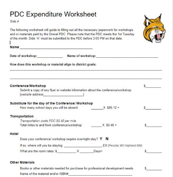 The following worksheet will guide to filling out all the necessary paperwork for workshops and or materials paid by the Drexel PDC. Please note that the PDC meets the first PD Monday each month.